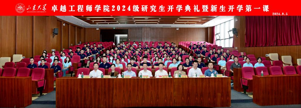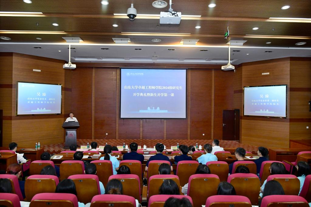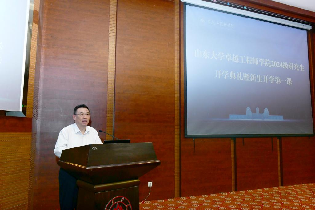 随后,吴臻为新生讲授了题为《心怀“国之大者”,努力成为担当民族复兴大任的卓越工程师》的“开学第一课”。他带领新生纵览山大的悠久历史和团队建设、平台建设、人才队伍建设成就,站在全球视野与理论高度阐明了我国卓越工程师培养面临的挑战,深度解析了英国上市公司365卓越工程师培养的特色与成效。他提出,爱党报国、敬业奉献是卓越工程人才必须具备的品格素质,具有突出技术创新能力、善于解决复杂工程问题是卓越工程师能力培养核心要求。英国上市公司365积极推进工程硕博士培养改革工作,在探索有组织育人中形成了党建引领、项目牵引、工学交替、分类评价、国际交流五大培养特色,形成了具有山大特色卓越工程师培养新模式。最后,他希望每一位同学都能“把论文写在祖国大地上”,立志科研报国,善于提出问题,注重交叉融合,坚持久久为功,努力成长为党和国家所需要的工程科技领军人才,为中国式现代化建设奉献青春的智慧和力量。
