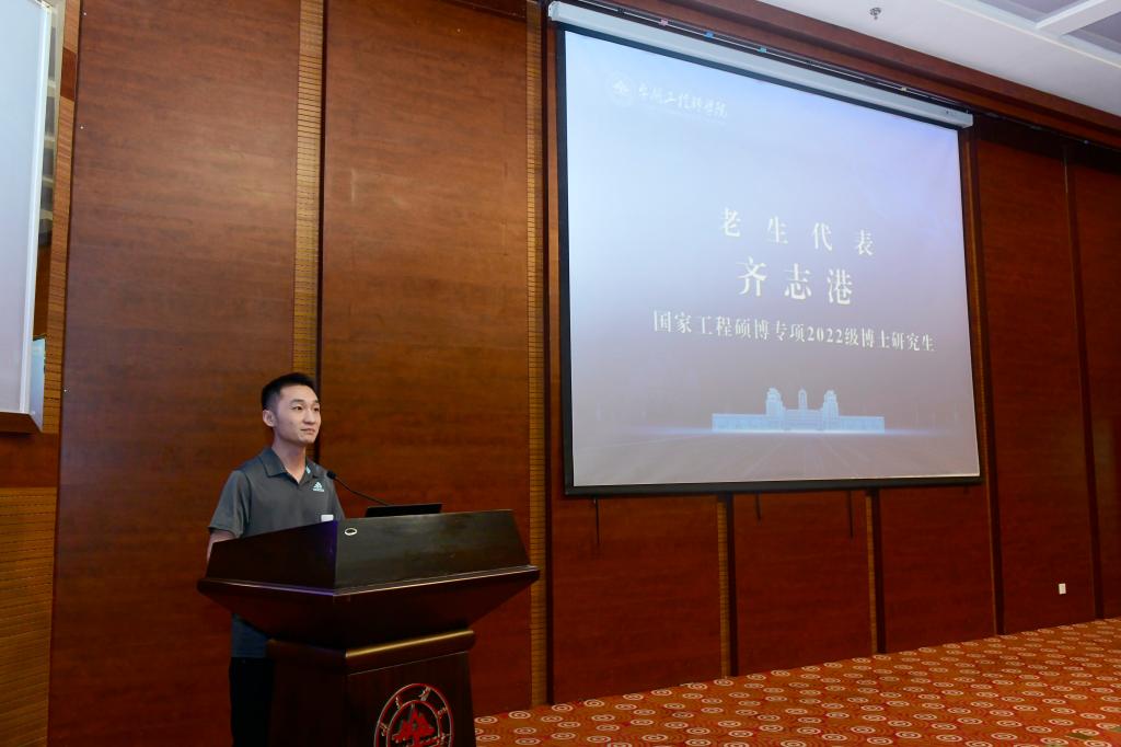 国家工程硕博专项2022级博士研究生齐志港代表老生发言。他结合自身经历,向新生介绍了学习体会和实践心得:要充分利用学校各类资源,夯基固本、学以致用;要用好入企实践的机会,培养动手能力;要珍惜各项有利政策,一心一意做科研,为壮大国家战略科技力量作出贡献。