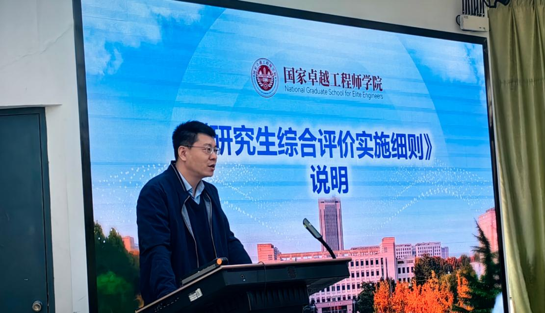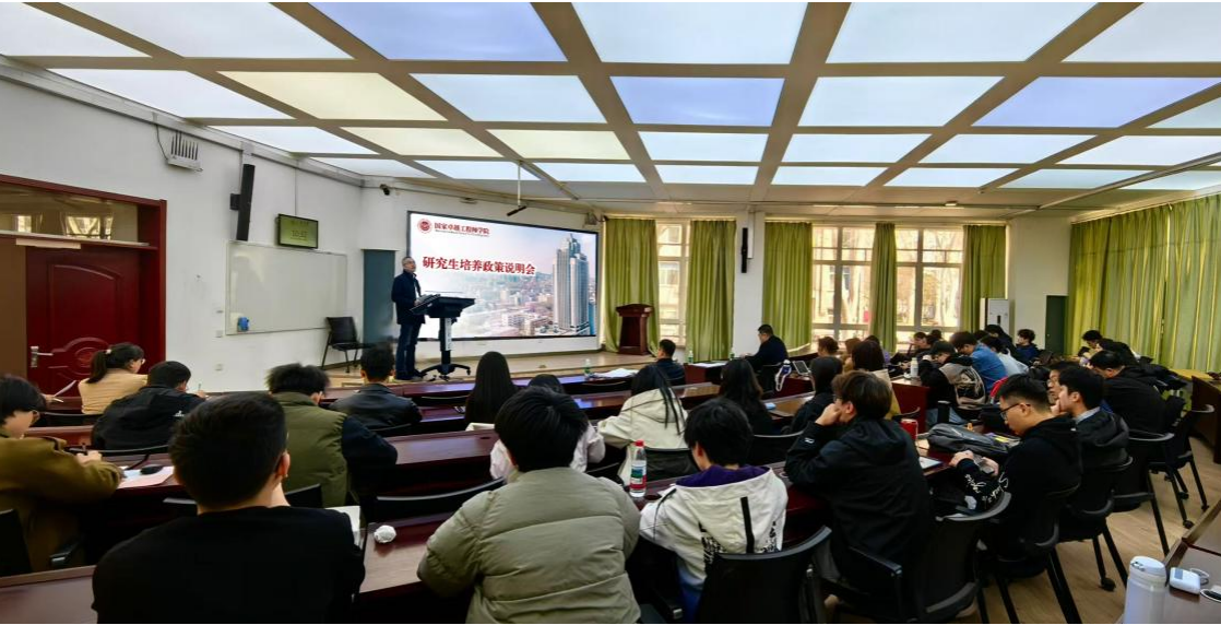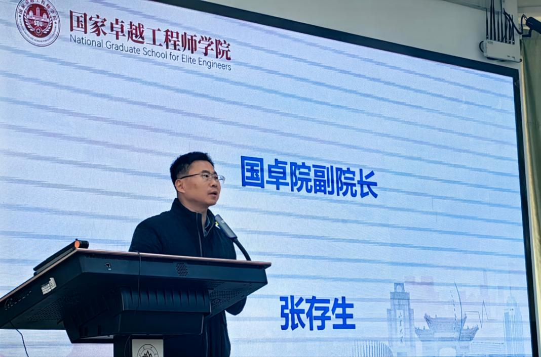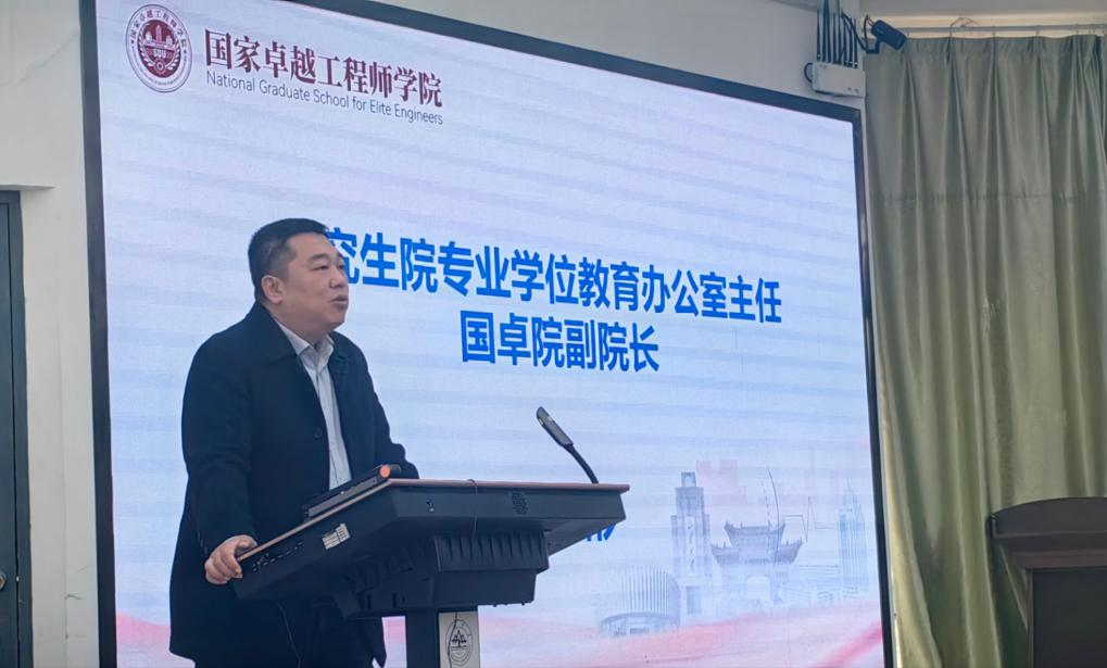 郑彬结合时代背景,向同学们介绍了国家、教育部对专业学位人才培养的要求,从战略定位、使命任务、成立历程、发展规划等方面介绍了学校国卓院的整体情况。他要求同学们要树立大志向,坚持“四个面向”,特别是面向国家重大需求,助力科技强国建设;要锤炼真本领,用好优势政策,真正走进企业生产一线,不断提升解决国家重大需求的硬实力;要解决真问题,坚持把论文写在祖国大地上,将科研成果转化为实际生产力,努力成长为爱党报国、敬业奉献、具有突出技术创新能力、善于解决复杂工程问题的卓越工程师。