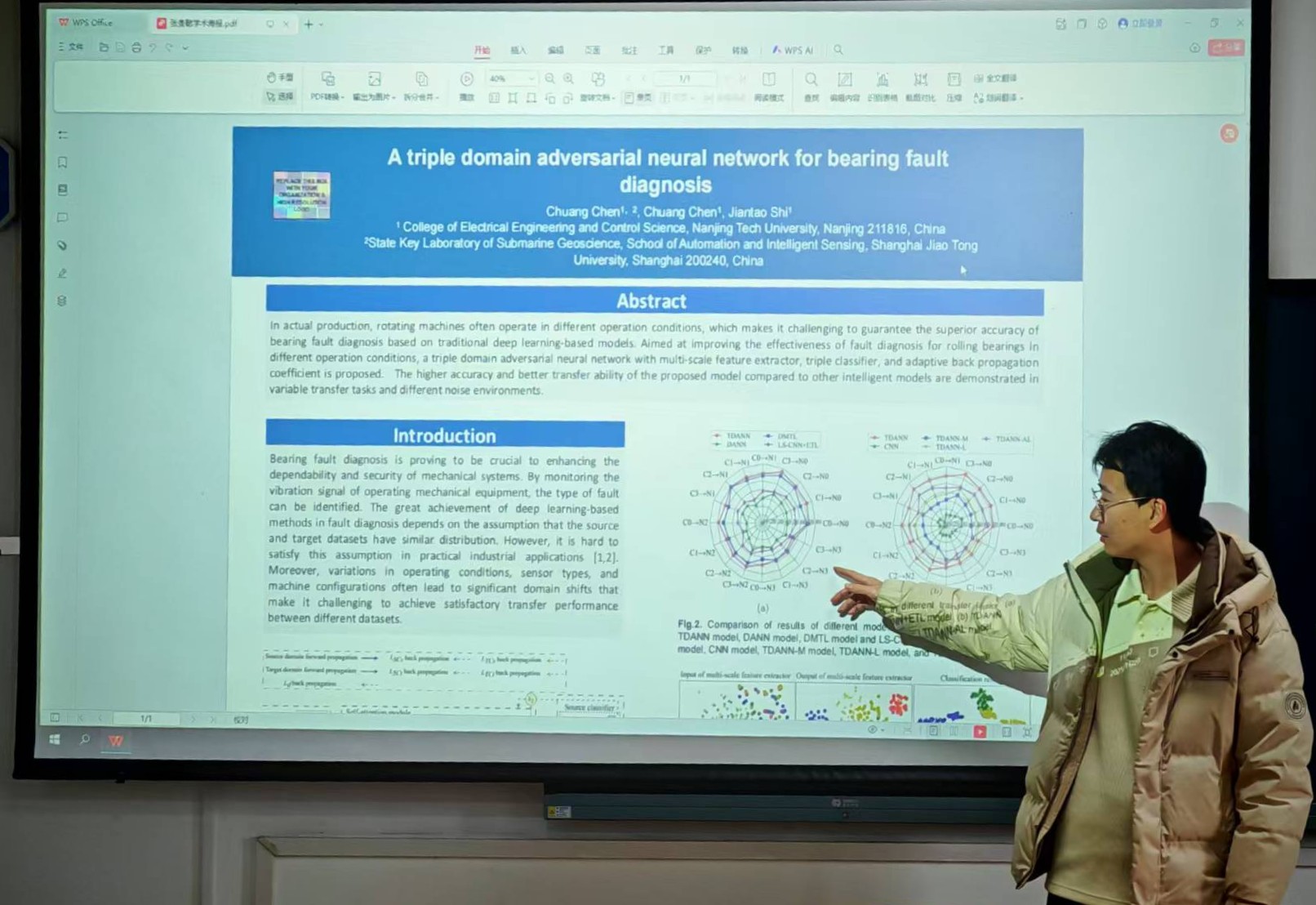 我在软件园校区教室进行报告,题目是《基于三域对抗神经网络的轴承故障诊断方法》。该研究针对传统深度学习模型在不同工况下轴承故障诊断准确率低、域迁移能力弱的核心痛点,提出了融合多尺度特征提取器、三重分类器与自适应反向传播系数的三域对抗神经网络。从设计模型结构、用CWRU 与实验室实测数据集验证,到攻克跨工况迁移难题,每一步都让我深知科研需严谨求实。该研究为工业设备预测性维护提供了高效方案,能助力提升我国高端制造业的设备可靠性与安全生产水平,未来我愿持续扎根科研,用青春之力为国家工业智能化发展添砖加瓦。