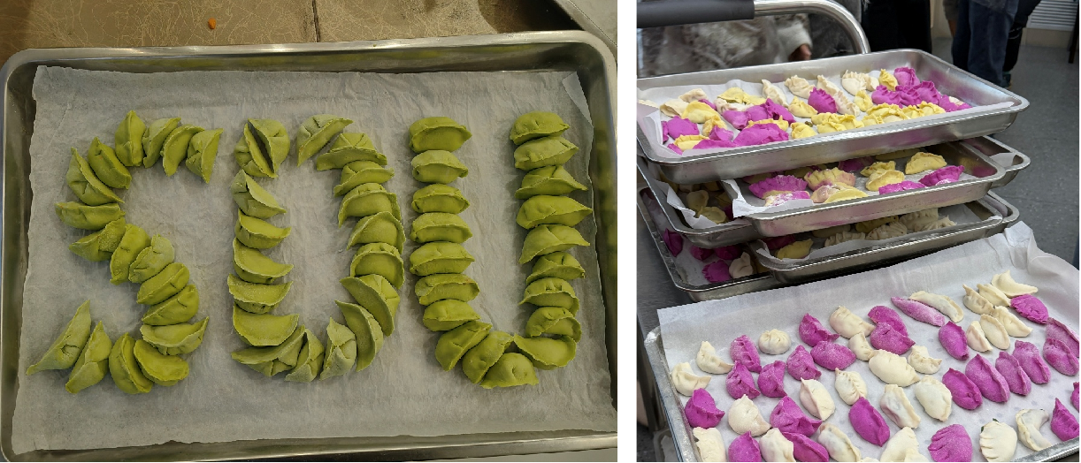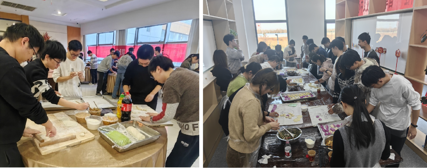 在活动的“重头戏”包饺子环节,来自不同联培学院的硕士生、博士生们化身面点工匠,薄薄的面皮在指尖流转,丰富的馅料被细心包裹,不一会儿,一个个形态各异的饺子便摆满了托盘——有的圆润饱满寓意团团圆圆,有的形似元宝象征硕果累累,更不乏极具创意的SDU摆型,现场欢笑声不断。大家一边交流着各自家乡的包法,一边动手实践,虽然手法生疏,形状各异,但缤纷的饺子摆在一起,格外热闹。